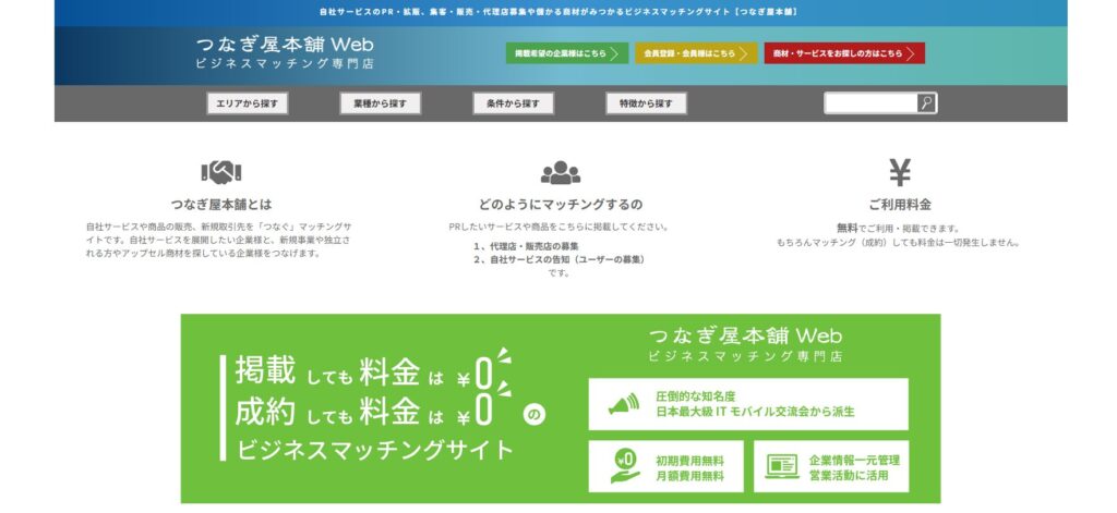 つなぎ屋本舗は、サービスのPRや顧客探しを支援するビジネスマッチングサイトです。